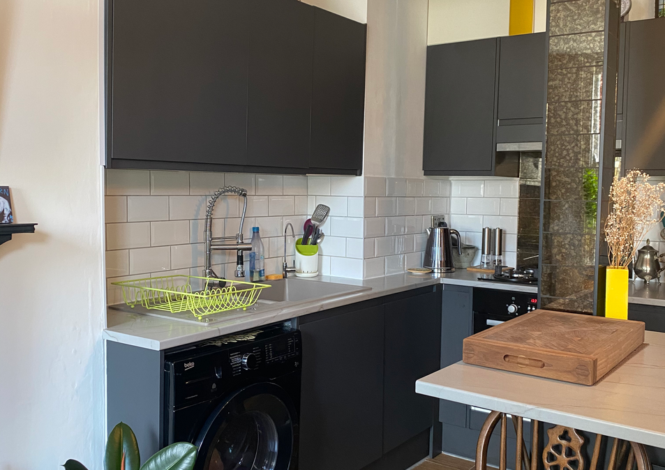 La gestion de l’espace de cet appartement n’était pas pratique et la construction n’était pas aux normes d’où l’incendie accidentel. La salle de bain était entre la cuisine et le salon. En accord avec l’assurance et le client nous avons ouvert la cloison entre la salle de bain et le salon, et avons transformé ce nouvel espace en cuisine ouverte avec un bar et un espace lounge/salon. La cuisine est devenue une salle de bain ce qui est beaucoup plus pratique car la chambre est maintenant juste à coté.