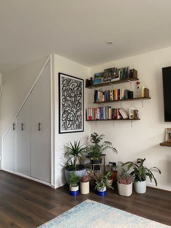 Le canapé, rangement du dressing et sous l’escalier et la cuisine ont été conçus par notre studio.